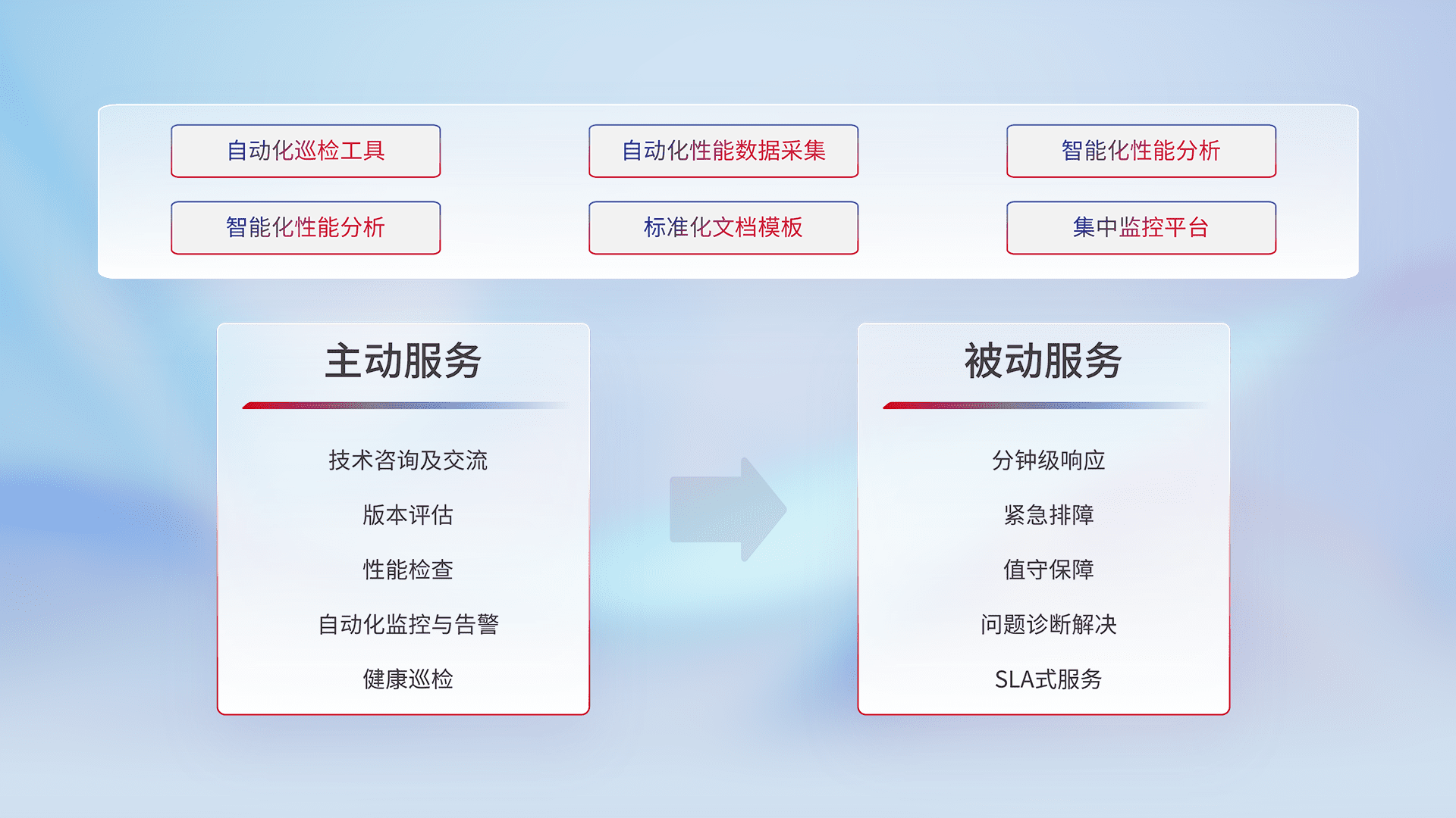 智能化工具和标准化文档,,,,保障服务质量,,,提供主动服务(包含技术咨询、、、、版本评估、、、、性能检查、、、自动化监控与告警、、、健康巡检)和被动服务包含(分钟级响应、、、紧急排障、、值守保障、、问题诊断解决、、、SLA服务)。。。