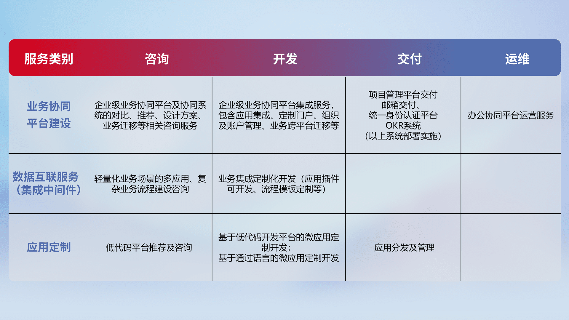 针对钉钉、、、、企微、、IDaas等平台级产品提供产品的规划、、、、方案、、、交付、、、、定制化开发等服务,,,,实现如统一协同办公、、、、智能客户服务、、、混合会议管理、、智能数据查询、、、、等业务场景,,,,实现数字化转型。。